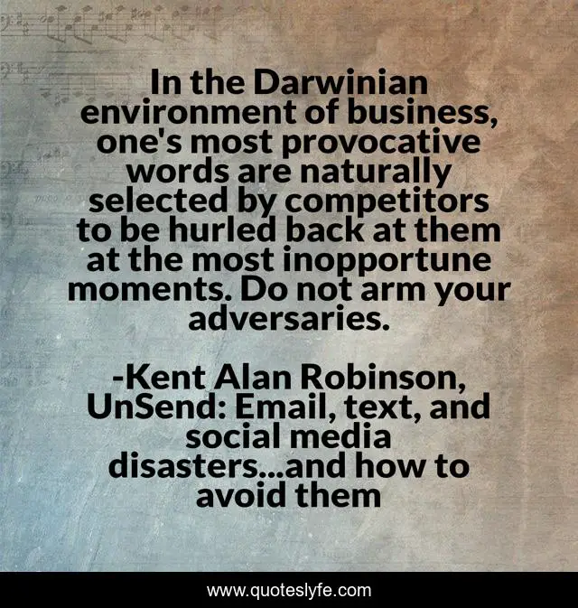 This page presents the quote "In the Darwinian environment of business, one's most provocative words are naturally selected by competitors to be hurled back at them at the most inopportune moments. Do not arm your adversaries.". Author of this quote is Kent Alan Robinson, UnSend: Email, text, and social media disasters...and how to avoid them. This quote is about business, human-resources-management, human-resources, management-and-leadership, businessss, leadership,.