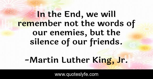 This page presents the quote "In the End, we will remember not the words of our enemies, but the silence of our friends.". Author of this quote is Martin Luther King, Jr.. This quote is about friends, silence, words,.