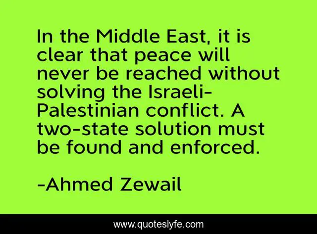This page presents the quote "In the Middle East, it is clear that peace will never be reached without solving the Israeli-Palestinian conflict. A two-state solution must be found and enforced.". Author of this quote is Ahmed Zewail. This quote is about solution, conflict,.