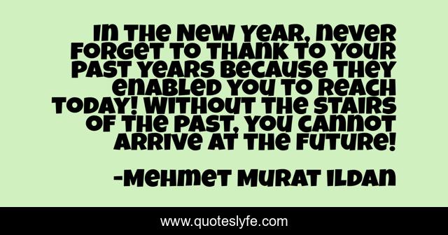 This page presents the quote "In the New Year, never forget to thank to your past years because they enabled you to reach today! Without the stairs of the past, you cannot arrive at the future!". Author of this quote is Mehmet Murat ildan. This quote is about new-year, past, new-years, mehmet-murat-ildan, ildan-wise-sayings, turkish, ildan-wisdom, turkish-playwrights, thanksgiving,.