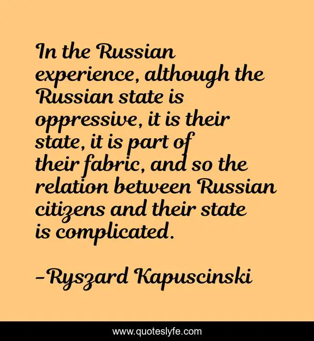 This page presents the quote "In the Russian experience, although the Russian state is oppressive, it is their state, it is part of their fabric, and so the relation between Russian citizens and their state is complicated.". Author of this quote is Ryszard Kapuscinski. This quote is about citizens, complicated,.