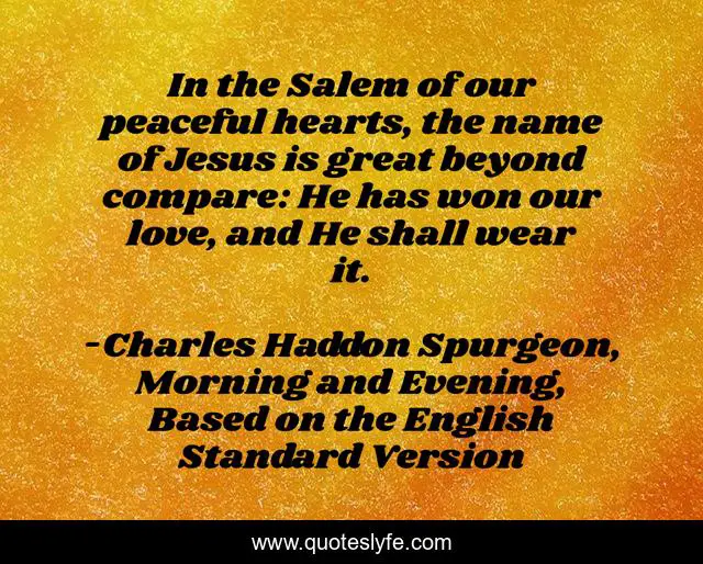 This page presents the quote "In the Salem of our peaceful hearts, the name of Jesus is great beyond compare: He has won our love, and He shall wear it.". Author of this quote is Charles Haddon Spurgeon, Morning and Evening, Based on the English Standard Version. This quote is about fruits-of-the-spirit, contentment, testimony,.
