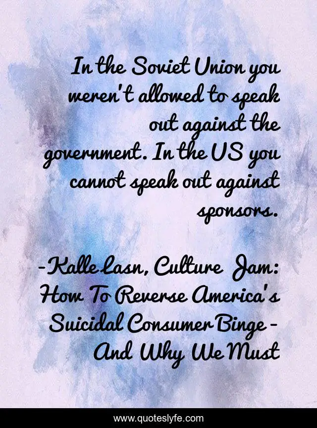 This page presents the quote "In the Soviet Union you weren’t allowed to speak out against the government. In the US you cannot speak out against sponsors.". Author of this quote is Kalle Lasn, Culture Jam: How To Reverse America's Suicidal Consumer Binge - And Why We Must. This quote is about consumerism, soviet-union, economics, commercial, sponsors, environment, advertising, culture-jam,.