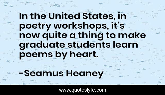 This page presents the quote "In the United States, in poetry workshops, it's now quite a thing to make graduate students learn poems by heart.". Author of this quote is Seamus Heaney. This quote is about students, heart, learn,.