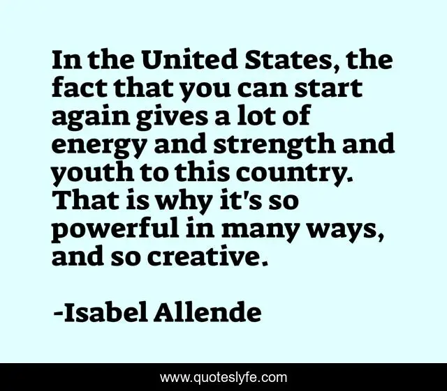 This page presents the quote "In the United States, the fact that you can start again gives a lot of energy and strength and youth to this country. That is why it's so powerful in many ways, and so creative.". Author of this quote is Isabel Allende. This quote is about youth, powerful, creative,.