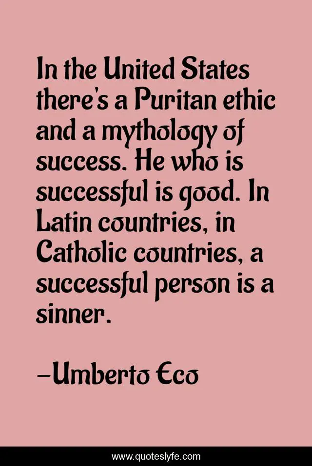 This page presents the quote "In the United States there's a Puritan ethic and a mythology of success. He who is successful is good. In Latin countries, in Catholic countries, a successful person is a sinner.". Author of this quote is Umberto Eco. This quote is about successful, person, good,.