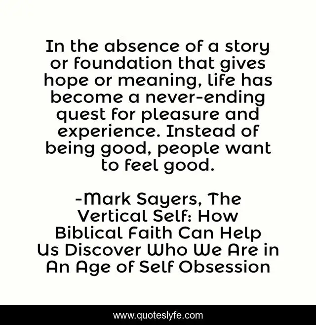 This page presents the quote "In the absence of a story or foundation that gives hope or meaning, life has become a never-ending quest for pleasure and experience. Instead of being good, people want to feel good.". Author of this quote is Mark Sayers, The Vertical Self: How Biblical Faith Can Help Us Discover Who We Are in An Age of Self Obsession. This quote is about faith, meaning, story, hope, pleasure,.