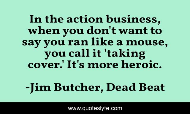 This page presents the quote "In the action business, when you don't want to say you ran like a mouse, you call it 'taking cover.' It's more heroic.". Author of this quote is Jim Butcher, Dead Beat. This quote is about heroism, humor, harry-dresden,.