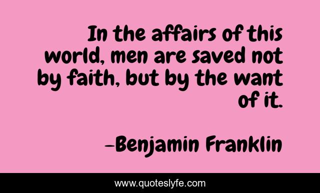 This page presents the quote "In the affairs of this world, men are saved not by faith, but by the want of it.". Author of this quote is Benjamin Franklin. This quote is about world, men,.