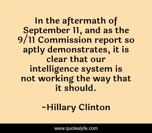This page presents the quote "In the aftermath of September 11, and as the 9/11 Commission report so aptly demonstrates, it is clear that our intelligence system is not working the way that it should.". Author of this quote is Hillary Clinton. This quote is about working, way, system,.