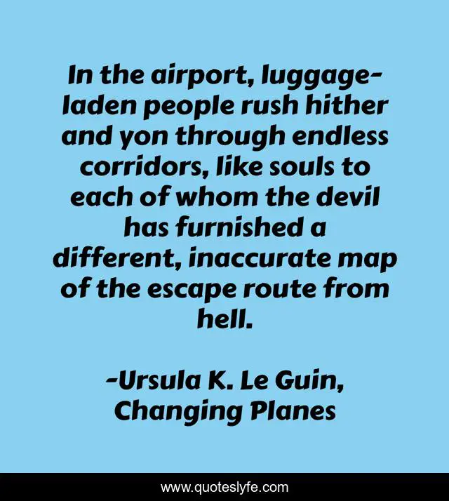 This page presents the quote "In the airport, luggage-laden people rush hither and yon through endless corridors, like souls to each of whom the devil has furnished a different, inaccurate map of the escape route from hell.". Author of this quote is Ursula K. Le Guin, Changing Planes. This quote is about hell, hell-on-earth, purgatory, air-travel,.