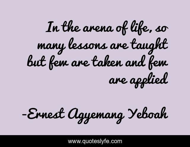 This page presents the quote "In the arena of life, so many lessons are taught but few are taken and few are applied". Author of this quote is Ernest Agyemang Yeboah. This quote is about decievers, educational, apply-what-you-learn, educational-philosophy, love, life, wisdom, life-lessons, courage,.