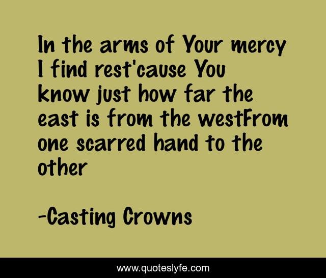 This page presents the quote "In the arms of Your mercy I find rest'cause You know just how far the east is from the westFrom one scarred hand to the other". Author of this quote is Casting Crowns. This quote is about mercy, christianity, rest, jesus,.