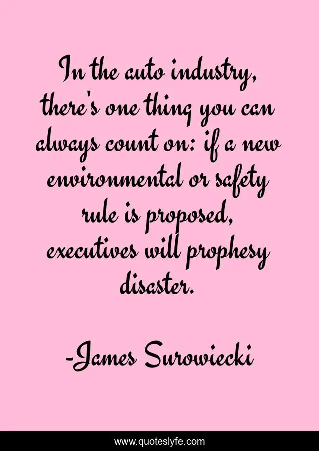 This page presents the quote "In the auto industry, there's one thing you can always count on: if a new environmental or safety rule is proposed, executives will prophesy disaster.". Author of this quote is James Surowiecki. This quote is about safety, disaster,.