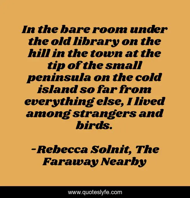 This page presents the quote "In the bare room under the old library on the hill in the town at the tip of the small peninsula on the cold island so far from everything else, I lived among strangers and birds.". Author of this quote is Rebecca Solnit, The Faraway Nearby. This quote is about home, 181, flight, ice, iceland,.