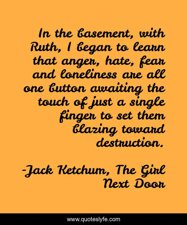 This page presents the quote "In the basement, with Ruth, I began to learn that anger, hate, fear and loneliness are all one button awaiting the touch of just a single finger to set them blazing toward destruction.". Author of this quote is Jack Ketchum, The Girl Next Door. This quote is about anger, fear, violence, hate, loneliness,.