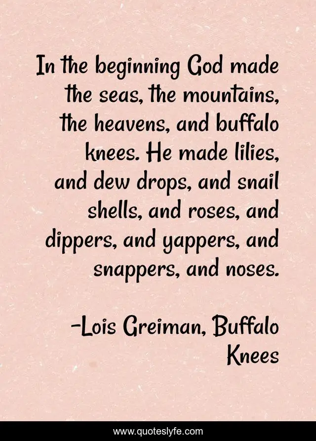 This page presents the quote "In the beginning God made the seas, the mountains, the heavens, and buffalo knees. He made lilies, and dew drops, and snail shells, and roses, and dippers, and yappers, and snappers, and noses.". Author of this quote is Lois Greiman, Buffalo Knees. This quote is about rhyming, children, enviornment,.