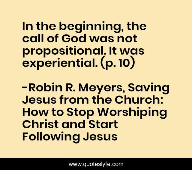 This page presents the quote "In the beginning, the call of God was not propositional. It was experiential. (p. 10)". Author of this quote is Robin R. Meyers, Saving Jesus from the Church: How to Stop Worshiping Christ and Start Following Jesus. .
