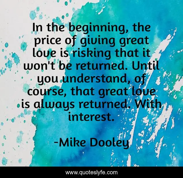 This page presents the quote "In the beginning, the price of giving great love is risking that it won't be returned. Until you understand, of course, that great love is always returned. With interest.". Author of this quote is Mike Dooley. This quote is about true-love, selfless-love,.