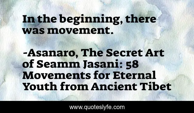 This page presents the quote "In the beginning, there was movement.". Author of this quote is Asanaro, The Secret Art of Seamm Jasani: 58 Movements for Eternal Youth from Ancient Tibet. This quote is about life-and-living, movement,.