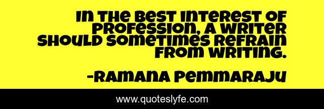 This page presents the quote "In the best interest of profession, a writer should sometimes refrain from writing.". Author of this quote is Ramana Pemmaraju. This quote is about no-mind, publication, pause-and-life, writing-life, monotony, press, article-writing, editor-of-your-life, soul-search,.