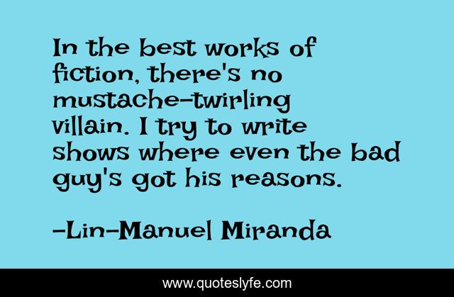 This page presents the quote "In the best works of fiction, there's no mustache-twirling villain. I try to write shows where even the bad guy's got his reasons.". Author of this quote is Lin-Manuel Miranda. This quote is about try, villain, bad,.