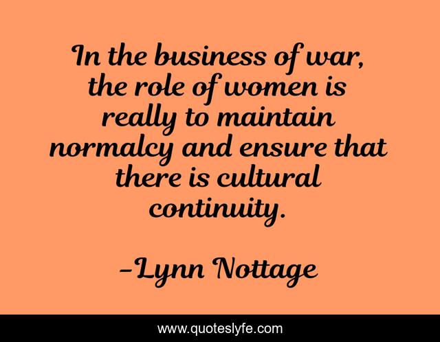 This page presents the quote "In the business of war, the role of women is really to maintain normalcy and ensure that there is cultural continuity.". Author of this quote is Lynn Nottage. This quote is about role, business, women,.