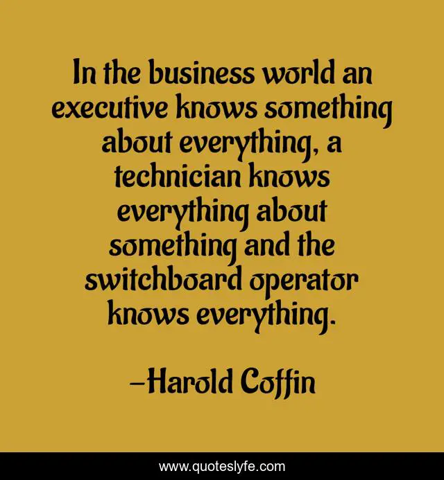 This page presents the quote "In the business world an executive knows something about everything, a technician knows everything about something and the switchboard operator knows everything.". Author of this quote is Harold Coffin. This quote is about world, everything,.