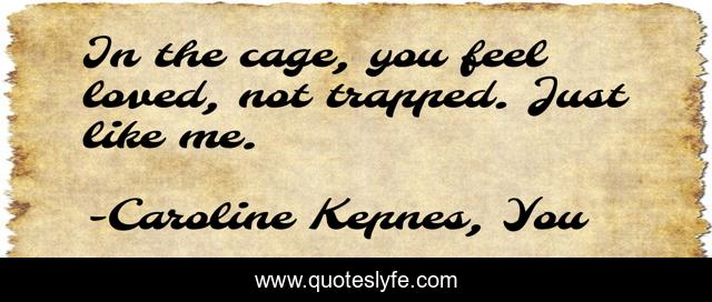 This page presents the quote "In the cage, you feel loved, not trapped. Just like me.". Author of this quote is Caroline Kepnes, You. This quote is about beck, cage, joe, loved,.
