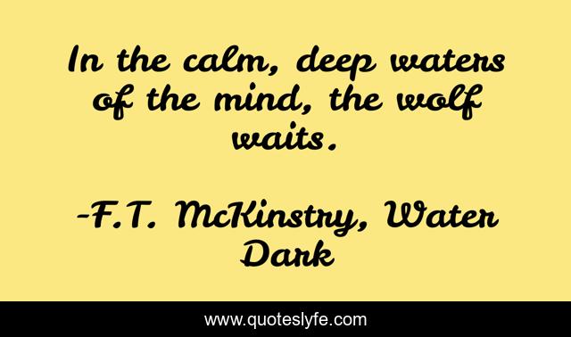 This page presents the quote "In the calm, deep waters of the mind, the wolf waits.". Author of this quote is F.T. McKinstry, Water Dark. This quote is about consciousness, mind, integration, water, wolf, shadow,.