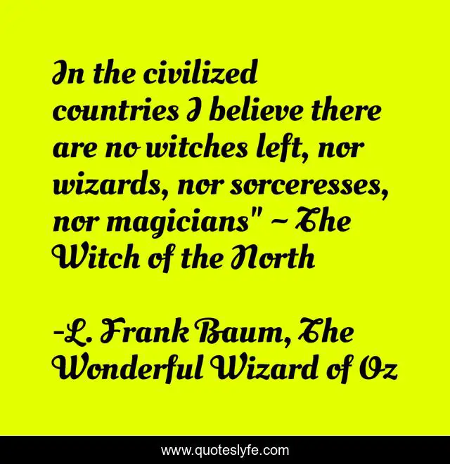 This page presents the quote "In the civilized countries I believe there are no witches left, nor wizards, nor sorceresses, nor magicians" ~ The Witch of the North". Author of this quote is L. Frank Baum, The Wonderful Wizard of Oz. This quote is about wizards, witches,.