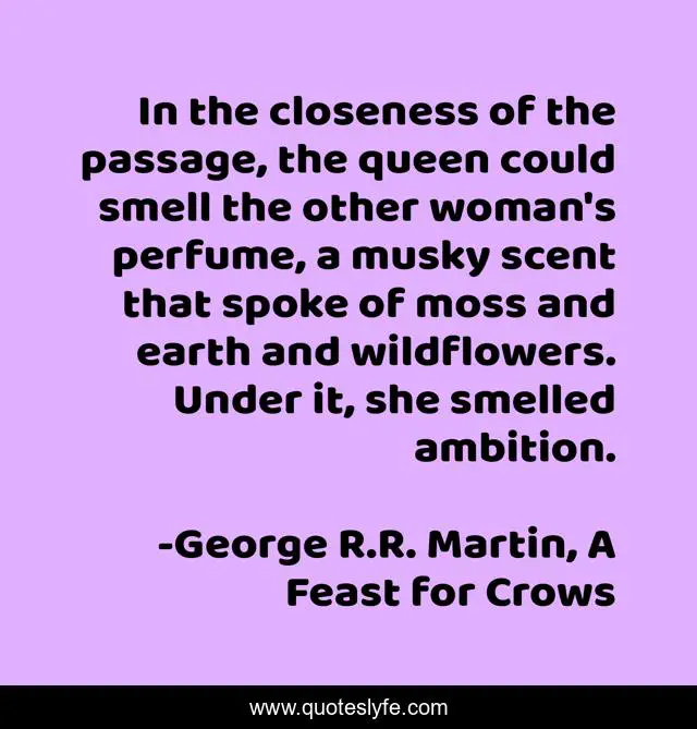 This page presents the quote "In the closeness of the passage, the queen could smell the other woman's perfume, a musky scent that spoke of moss and earth and wildflowers. Under it, she smelled ambition.". Author of this quote is George R.R. Martin, A Feast for Crows. This quote is about ambition, lady-merryweather, cersei,.