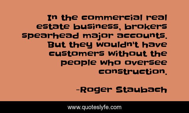 This page presents the quote "In the commercial real estate business, brokers spearhead major accounts. But they wouldn't have customers without the people who oversee construction.". Author of this quote is Roger Staubach. This quote is about construction, real estate,.