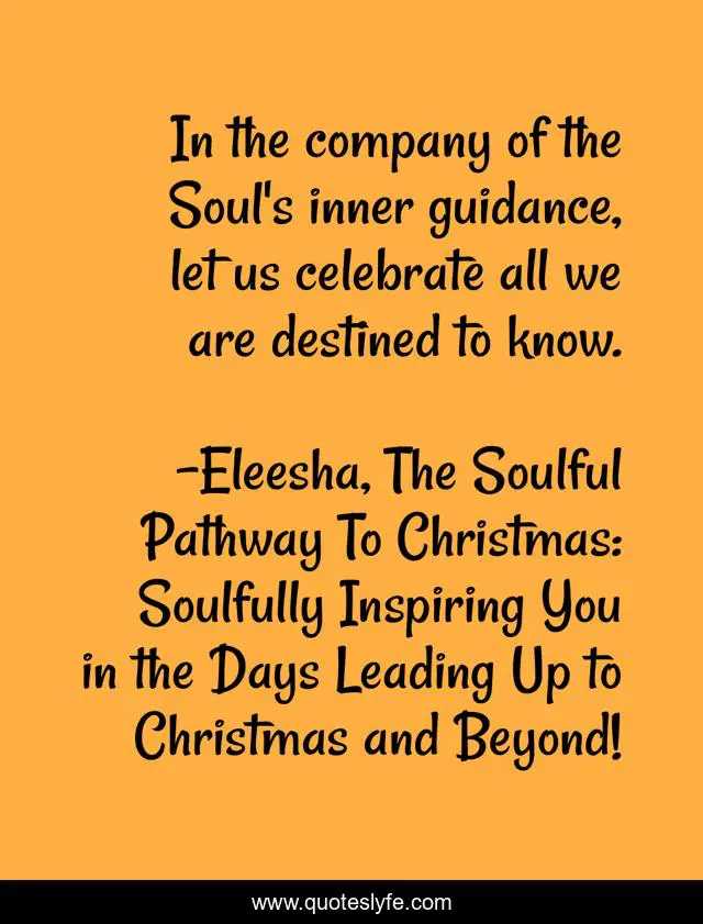 This page presents the quote "In the company of the Soul's inner guidance, let us celebrate all we are destined to know.". Author of this quote is Eleesha, The Soulful Pathway To Christmas: Soulfully Inspiring You in the Days Leading Up to Christmas and Beyond!. This quote is about christmas-spirit, positive, motivational, empowerment, soul, quotes, channeling, inspirational, affirmations,.