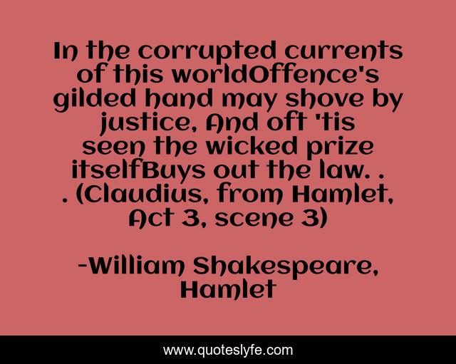This page presents the quote "In the corrupted currents of this worldOffence's gilded hand may shove by justice, And oft 'tis seen the wicked prize itselfBuys out the law. . . (Claudius, from Hamlet, Act 3, scene 3)". Author of this quote is William Shakespeare, Hamlet. This quote is about corrupt, corruption,.