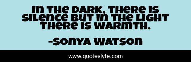 This page presents the quote "In the dark, there is silence but in the light there is warmth.". Author of this quote is Sonya Watson. This quote is about life-goals, hopeful, sad, sadness, happy-life, hopeful-and-encouraging, sadness-loneliness, happiness,.
