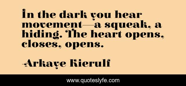 This page presents the quote "In the dark you hear movement—a squeak, a hiding. The heart opens, closes, opens.". Author of this quote is Arkaye Kierulf. This quote is about heart, dark, close, hiding, open, movement,.