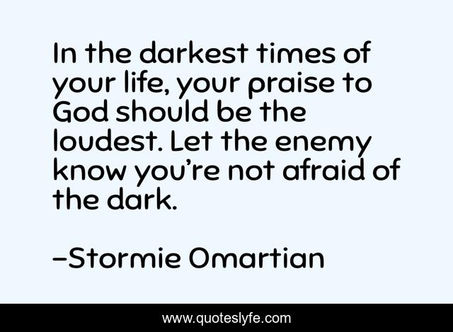 This page presents the quote "In the darkest times of your life, your praise to God should be the loudest. Let the enemy know you’re not afraid of the dark.". Author of this quote is Stormie Omartian. This quote is about motivation, christian, uplifting, powerful, encouraging, encouragement, jesus, spirituality, inspirational,.