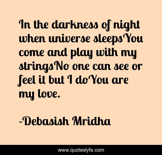 This page presents the quote "In the darkness of night when universe sleepsYou come and play with my stringsNo one can see or feel it but I doYou are my love.". Author of this quote is Debasish Mridha. This quote is about life, love, knowledge, inspirational, intelligence, philosophy, wisdom, quotes, affection,.