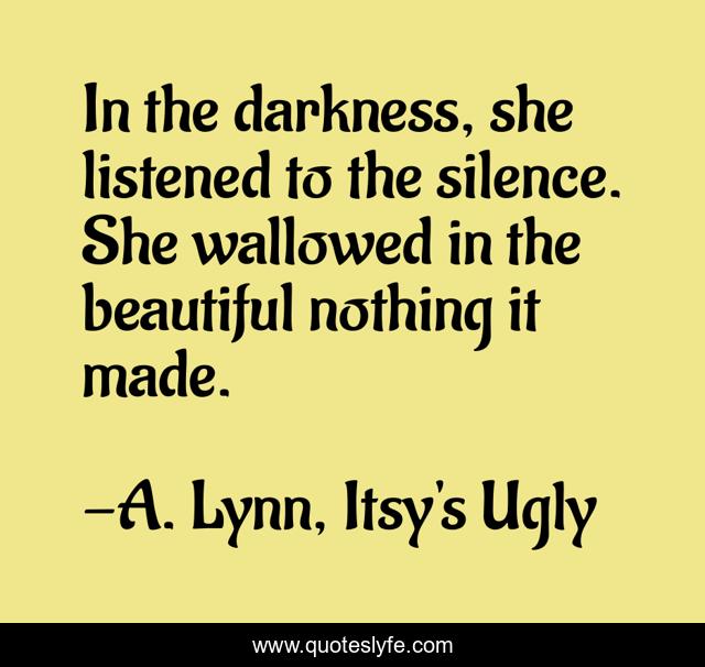 This page presents the quote "In the darkness, she listened to the silence. She wallowed in the beautiful nothing it made.". Author of this quote is A. Lynn, Itsy's Ugly. This quote is about beauty-in-nature, wallow, darkness, silence,.