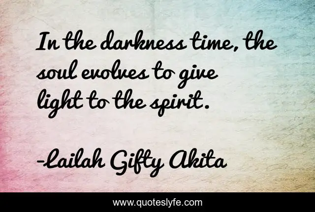 This page presents the quote "In the darkness time, the soul evolves to give light to the spirit.". Author of this quote is Lailah Gifty Akita. This quote is about philosophy, soul, adversity, inspirational, enthusiasm, difficulties-of-life,.