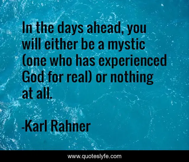 This page presents the quote "In the days ahead, you will either be a mystic (one who has experienced God for real) or nothing at all.". Author of this quote is Karl Rahner. This quote is about mystic, experience,.