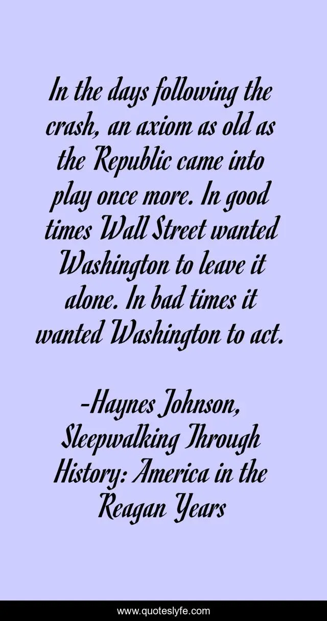 This page presents the quote "In the days following the crash, an axiom as old as the Republic came into play once more. In good times Wall Street wanted Washington to leave it alone. In bad times it wanted Washington to act.". Author of this quote is Haynes Johnson, Sleepwalking Through History: America in the Reagan Years. This quote is about reagonomics, hypocrisy, wall-street,.