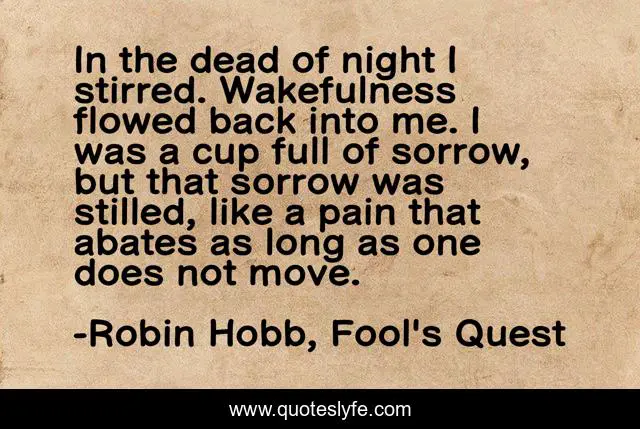 This page presents the quote "In the dead of night I stirred. Wakefulness flowed back into me. I was a cup full of sorrow, but that sorrow was stilled, like a pain that abates as long as one does not move.". Author of this quote is Robin Hobb, Fool's Quest. This quote is about full, pain, remember, sorrow, wakefulness, contemplate, stillness, awake, numb,.