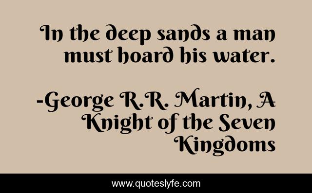 This page presents the quote "In the deep sands a man must hoard his water.". Author of this quote is George R.R. Martin, A Knight of the Seven Kingdoms. This quote is about water, hoard, sands,.