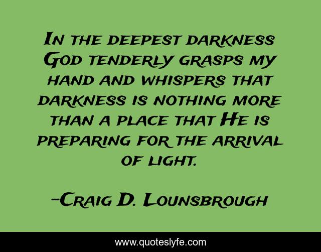 This page presents the quote "In the deepest darkness God tenderly grasps my hand and whispers that darkness is nothing more than a place that He is preparing for the arrival of light.". Author of this quote is Craig D. Lounsbrough. This quote is about lonely, darkness, isolation, dark, sadness, god, alone, depression,.