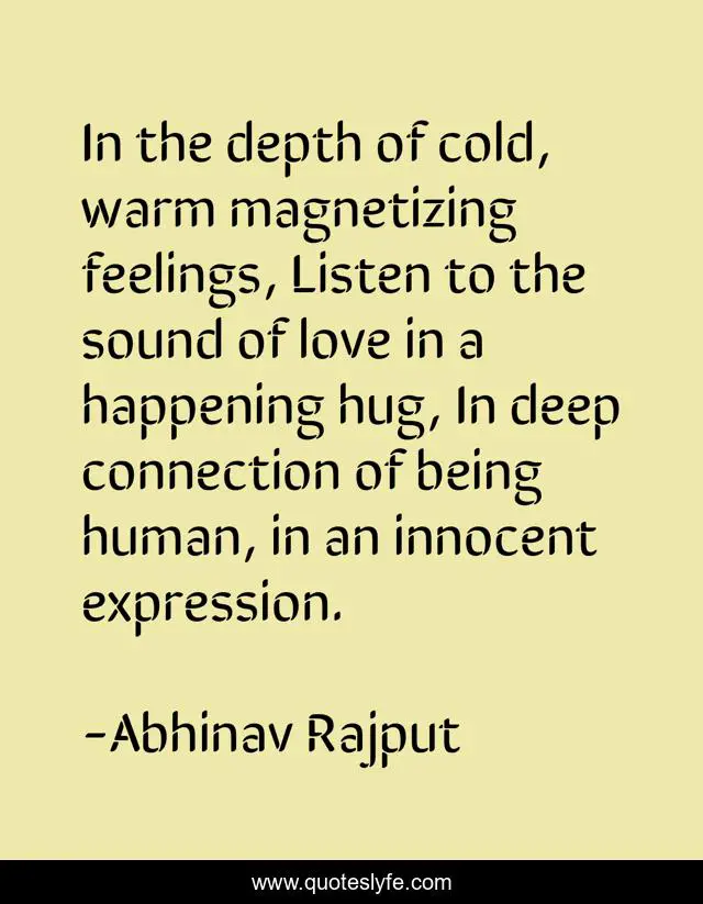 This page presents the quote "In the depth of cold, warm magnetizing feelings, Listen to the sound of love in a happening hug, In deep connection of being human, in an innocent expression.". Author of this quote is Abhinav Rajput. .