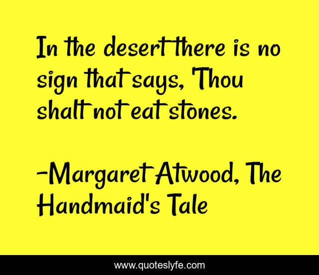 This page presents the quote "In the desert there is no sign that says, 'Thou shalt not eat stones.". Author of this quote is Margaret Atwood, The Handmaid's Tale. This quote is about dystopian-novel, science-fiction, speculative-fiction,.