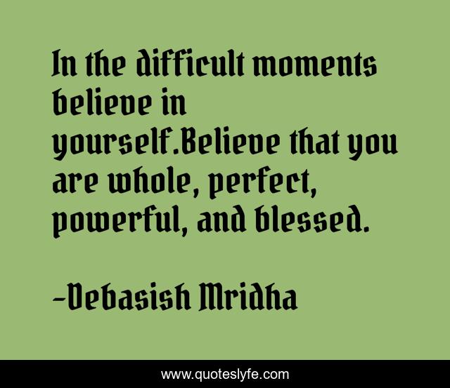 This page presents the quote "In the difficult moments believe in yourself.Believe that you are whole, perfect, powerful, and blessed.". Author of this quote is Debasish Mridha. This quote is about perfect, life, debasish, moments, mridha, philosophy, powerful, blessed, believe,.
