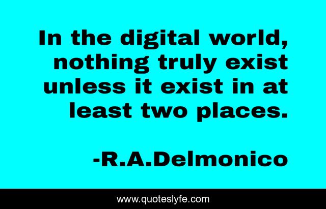 This page presents the quote "In the digital world, nothing truly exist unless it exist in at least two places.". Author of this quote is R.A.Delmonico. .